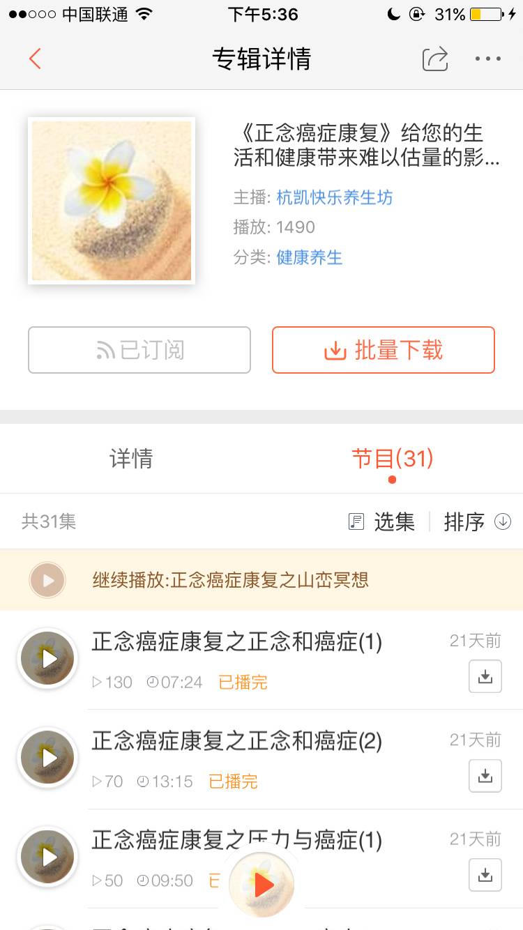 刚做完保乳手术,近两日晚上睡眠容易早醒,醒来感觉紧张和焦虑。尝试练习正念,感觉不错,能放松宁静,继续入睡,可从喜马拉雅电台中找图片中的语音书,引导练习,分享给有需要的姐妹。