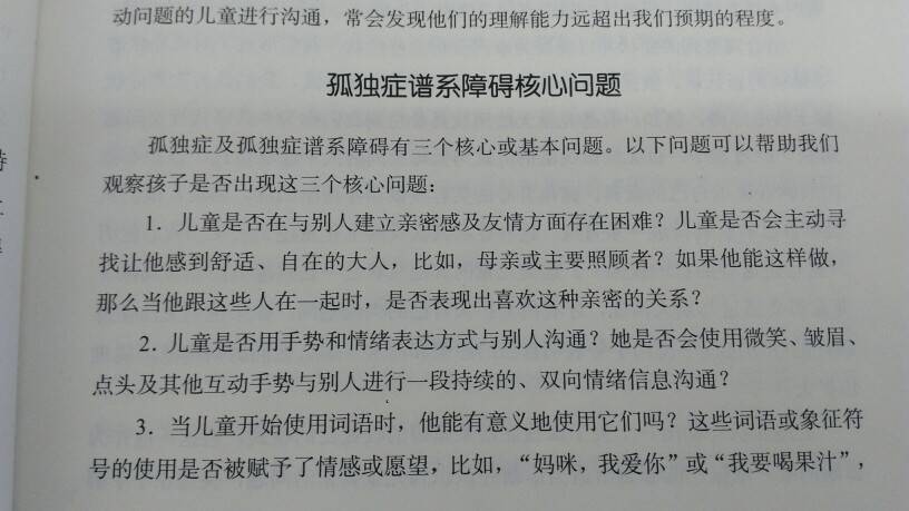 下面这张图是自闭症的三大核心问题,我觉得除了第二点溪溪有点欠缺,其他方面都很好,溪溪非常黏我,每次见到我都会高兴地跳起来,那么可爱的儿子,妈妈一定努力,让你早日摘掉自闭的帽子。