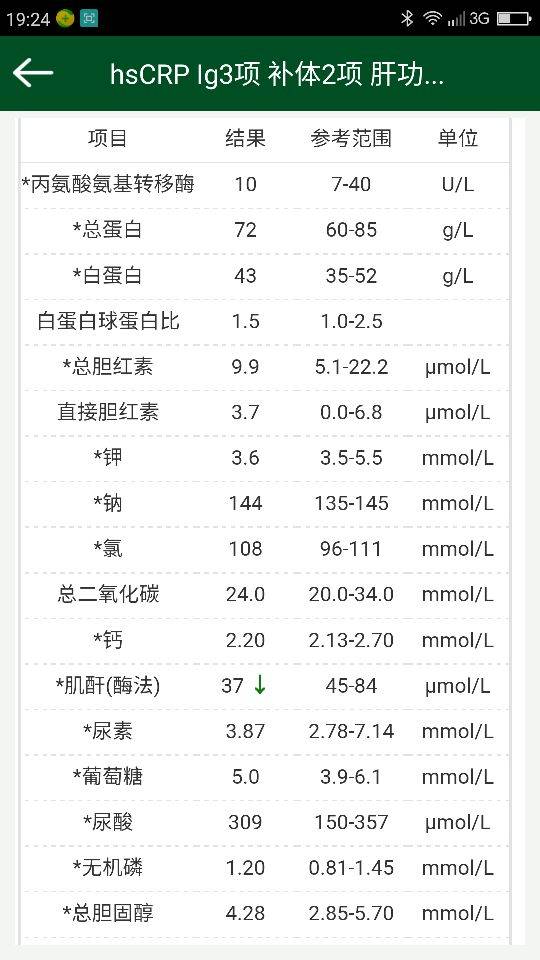 就是白细胞稍低了一点,注意感染,肌酐稍低,注意补充营养,,其他的我就看不太懂了,应该都还比较好的结果