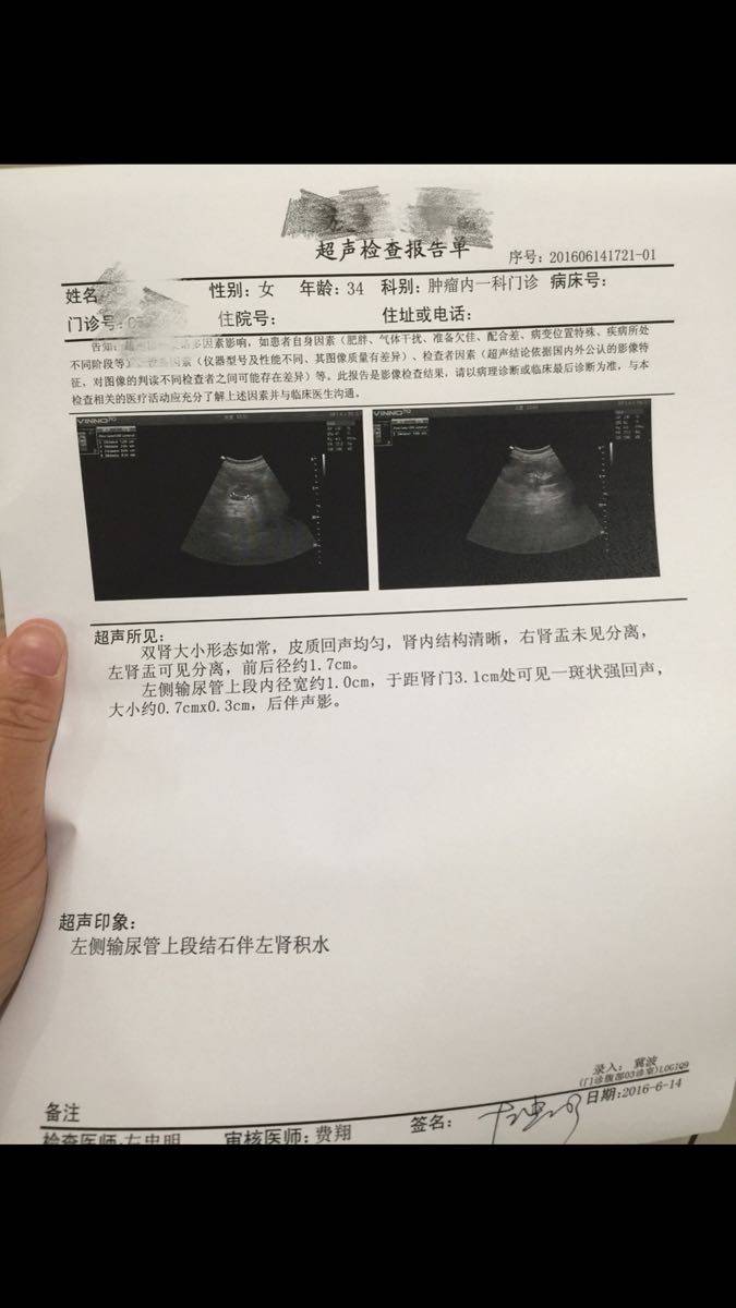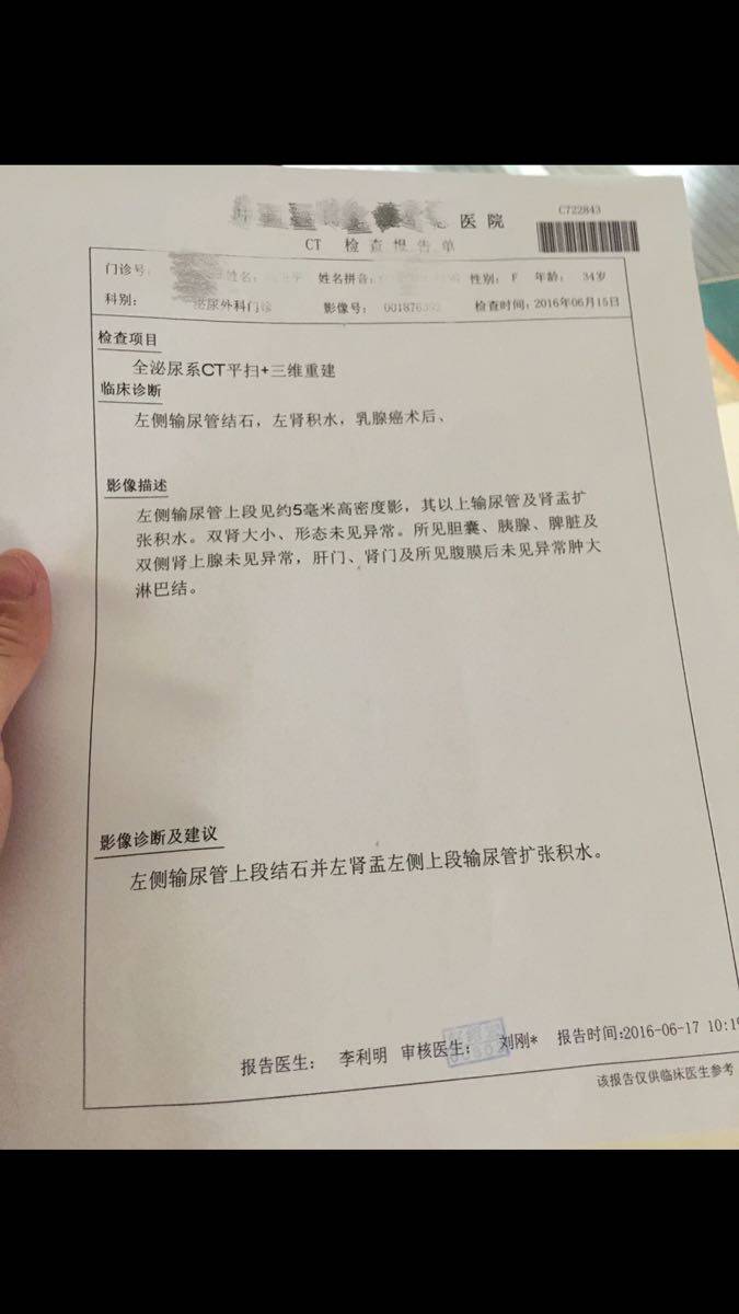 6月复查时,医生开了腹部B超检查,说左孟肾分离,左侧输尿管结石伴左肾积水。又增加了一项检查,全泌尿CT平扫 三维重建。最后建议我做一个无创的体外碎石。做碎石,躺机器上,感觉左腰有个东西,在一直拍打,估计拍打了小一两千下有的,大概四十分钟。碎完就发现左腰淤血了,第一趟厕所尿的血尿,说如果第二天还是血尿就得回医院看看,还好,就碎完第一次尿血了,之后就没有了。回去休息这半个月,需要加强跑步、跳绳等运动,争取能早点尿出结石来。还好,第二天就有一些小碎石排出,后来再凭我怎么努力,再也没有尿出来过碎石。