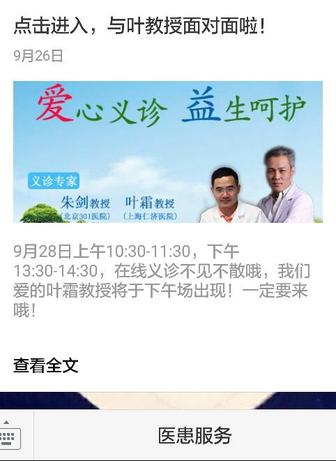 大家都爱的叶霜教授将于9月28日下午13:30-14:30在全国风湿年会期间,与广大患者在手机视频相遇,您只需拿出手机即可与叶教授面对面解决您的困扰。经常看叶霜的小伙伴么这是不错的机会