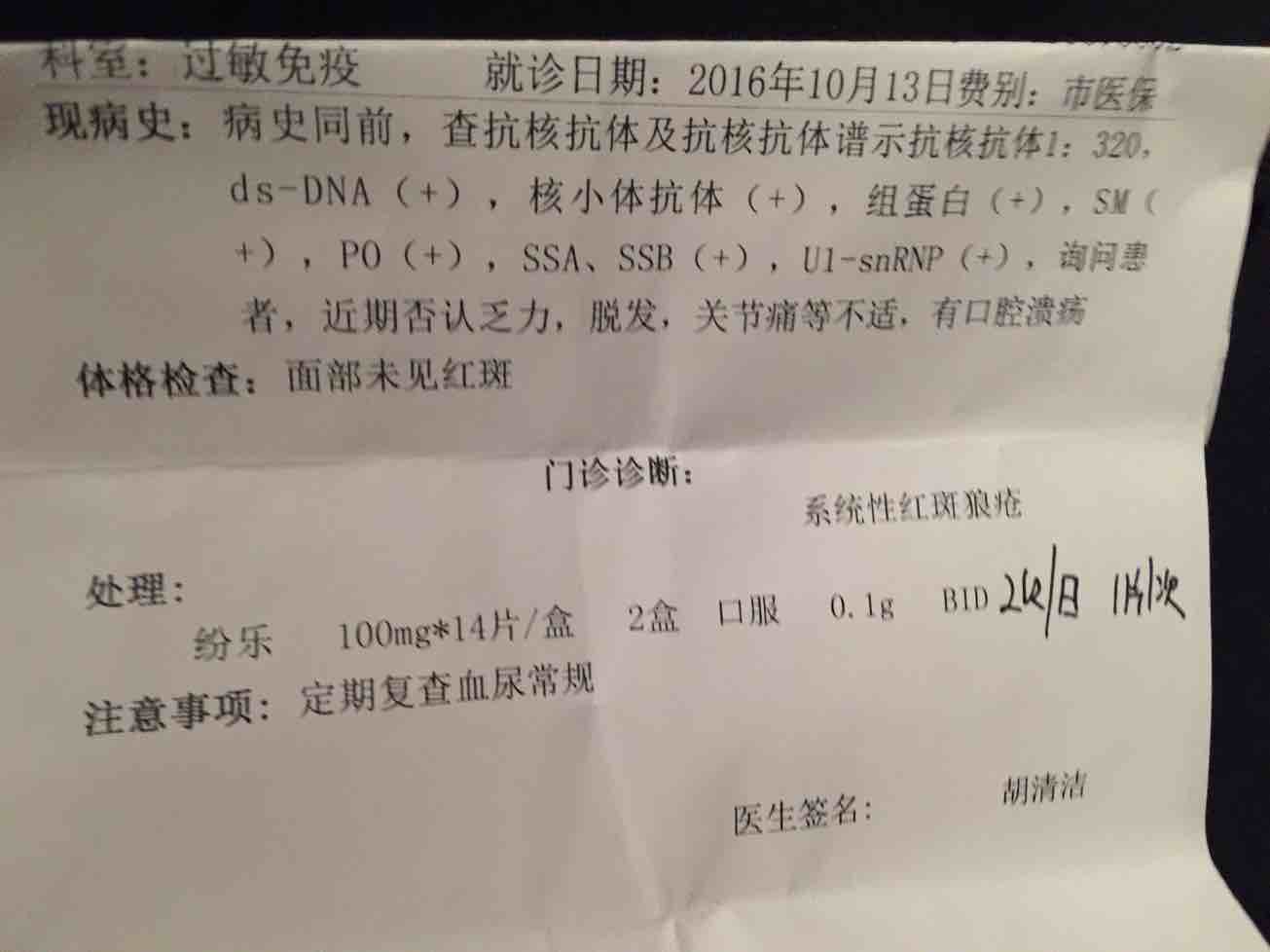 09年查出来患了红斑狼疮,关节痛,发烧,咳嗽,住院半个月,以后两年一直吃强的松,中间有五六年没有吃任何药,也没有任何症状,今年6月身上出现红斑,也不知道是寻麻疹还是什么,自己害怕是不是复发了,就去体检,查抗体,结果是阳性,应该是复发了,心情好差,我还准备备孕……现在在吃纷乐,每天两片