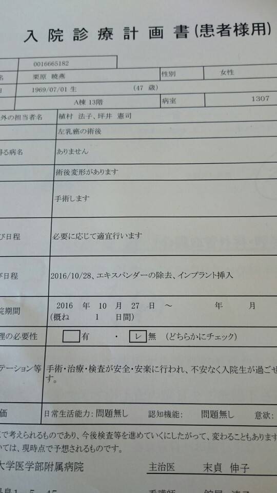 今天住院手术一切准备就绪,明天下午手术,跟我同病房的一位六十二岁的老大姐也做重建手术,真的很佩服她的勇气,而且她非常阳光,对重建后充满自信 !给我也带来了正能量 !😄姐妹们为我加油吧💪谢谢大家了🙏手术成功再与大家一起分享我的喜悦😊今天要吃饱喝足养足精神,迎接明天的手术