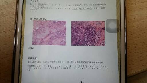 有些不清但分析你的三项免疫化组合都是阴性表示雌激素和孕激素和表皮因子受体都是阴性不受人体前两项调控也就是说术后无药可用
