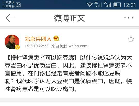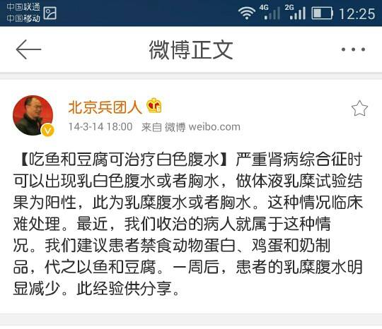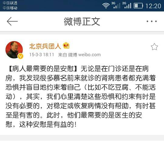 北京大学第一医院肾脏内科主任医生周福德主任是这么说的(请看下面的图),这是他的微博截图。