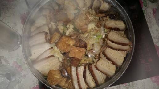 阴雨绵绵,家里也没有暖气,老公给做好了火锅,配菜:烧肉、炸豆腐,炸土豆、香菇、黄花菜、丸子、白菜,坐在电暖器边,吃热火锅,暖暖地!老公厨艺不错呀!谢谢你的关爱!