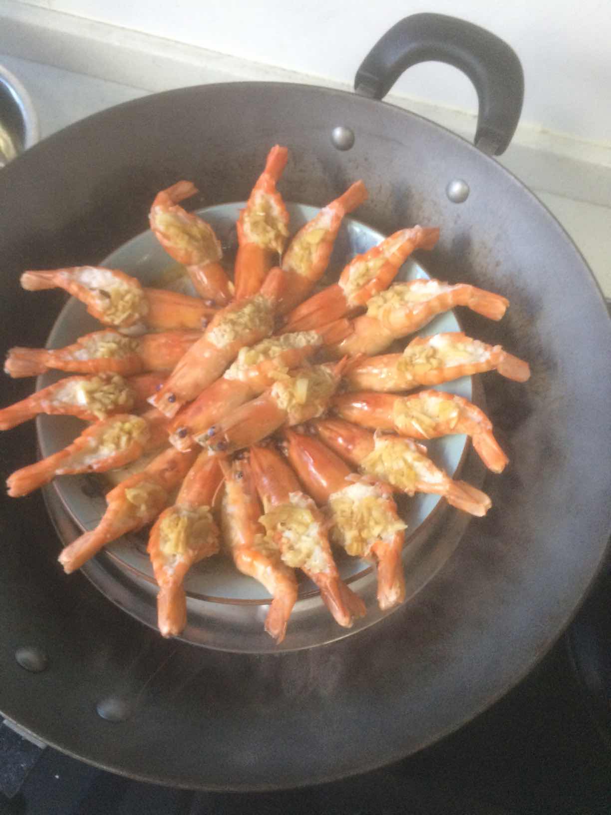 6、锅中烧热水水开后放入虾子大火蒸个6分钟。因为虾已经开背,肉很薄很好熟,所以蒸的时间不需要很长。