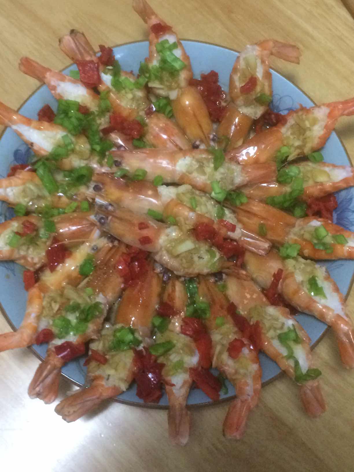 7、之后虾上撒葱花,虾的间隙装饰红辣椒丁,最后烧热油浇在虾上即可上桌。