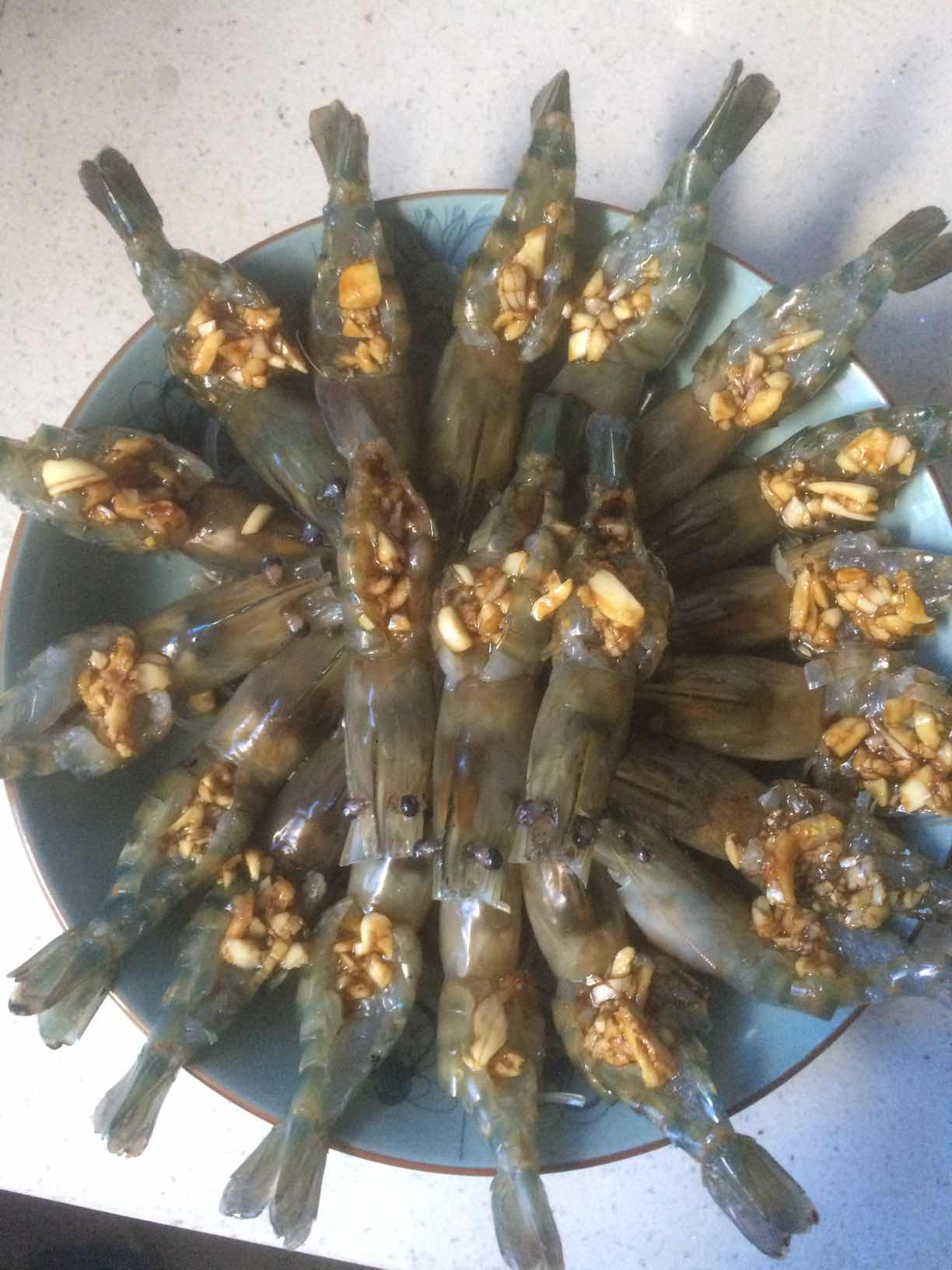 5、然后把蒜泥汁淋在虾子上。