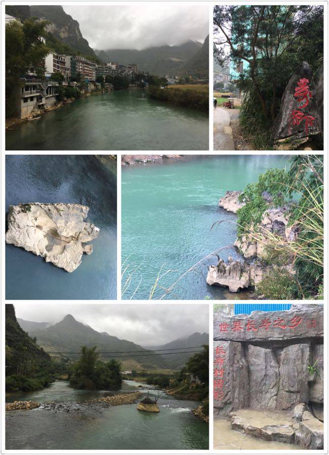 坡月村距长寿村有近五公里的路程,一路时而毛毛雨,时而小雨哗啦啦,我和老公就这样哼着小曲穿行于雨中,大约一个小时我们到了村口。所谓长寿村它的原名叫巴盘屯,位于甲篆乡平安村,是平安村的一个自然村。但现在已经没有人把它叫巴盘屯了,早已得名长寿村,并且是闻名于海内外的长寿村。长寿村依山傍水,四周环山,巴马的母亲河——盘阳河穿村而过。在世界卫生组织对巴马人所做的健康调查中发现,居住在巴马的人没有一个是肥胖、高血压、三脂高、糖尿病、痛风等老年疾病的,甚至连一例癌症也未曾发现。据多方调查取证,负氧离子含量高是巴马长寿村人长寿的最重要秘诀。在村口宣传栏上有6位百岁老人,但有近期有3位老人相继去世,目前有3位百岁老寿星健在。