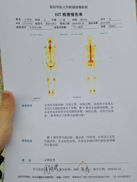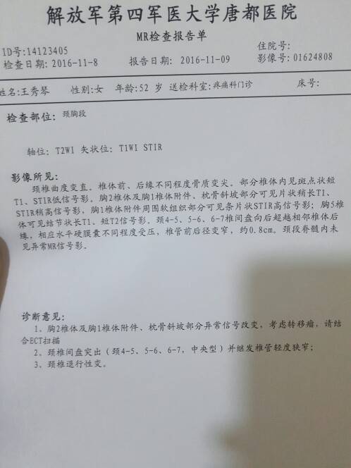 母亲51岁右肺腺癌,2016年3月17日确诊,31日开始盲试凯美纳后有效,直到近期开始出现颈椎僵硬,抽的脖子头疼,做了核磁头颅显示未见异常,颈胸段核磁显示胸1,2及枕骨斜坡异常,可是为啥ECT没有显示颈椎代谢异常,现在医生建议放疗局部,听说腺癌对放疗不敏感,怎么办,害怕母亲受罪还治不好疼痛,母亲现在免疫力状态还好,就怕放疗副作用太大。在线等,病友家属大家有啥意见,望指导