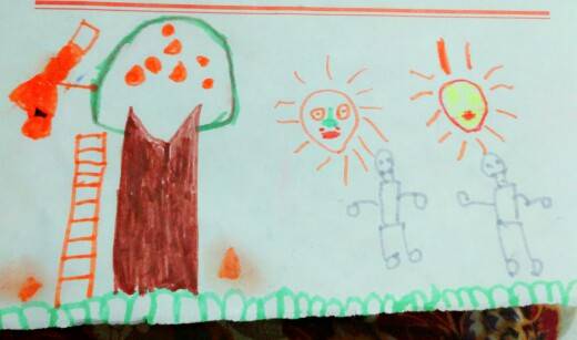 姐妹们!周末愉快!周末又是我陪小孙子玩的时候了,今天好大的太阳,我就好好的晒晒太阳,看他玩的多起劲!他说他昨天画了一副画,画了两个太阳今天就出来了好大一个太阳啦!大家看了是不是超好笑吧!