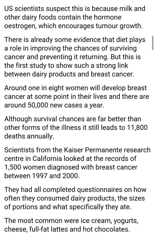 刚刚在英国健康网站看到的资讯 --每天食用乳制品:包括奶酪,酸奶,冰淇淋等,因其中可能含有的雌激素成份会促使ai细胞生长,使乳腺癌的死亡率增加50%[1f631