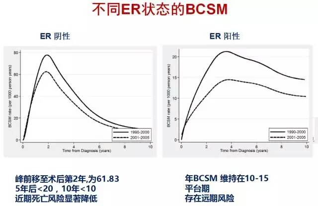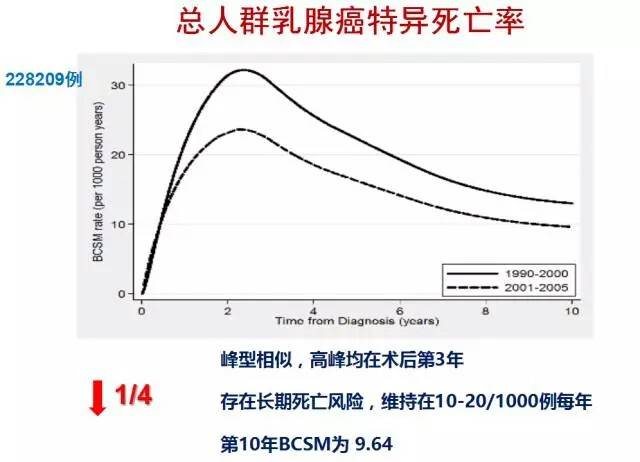 下图(图2)是今年刚刚发表的一篇论文里的数据,我总结了22万美国乳腺癌患者在90年代初和进入20世纪以来,跟踪十年生存率对比。从20世纪以后的这条虚线曲线我们可以看出,乳腺癌在2-3年出现一个峰值(2%左右的死亡率)后,随着时间的推进,会逐渐下降到5年以后的每年1%左右,也就是说我们乳腺癌累计十年的总生存率可以达到85%以上,是一个非常乐观的预后。其次,通过对比90年代和2000年以后这两条曲线,我们可以发现,他们形态完全一致,也就是说,通过新的治疗手段的使用,通过我们更加科学有效的综合治疗(化疗、内分泌治疗、靶向治疗等等),治愈率上获得了整体提升,而不只是推迟疾病的复发转移或死亡时间,否则在波形上应该会出现延迟。因此,我希望大家一定要有信心,一定要积极配合我们完成既定的治疗方案,因为新的治疗策略意味着治愈更多的患者。如果期间有任何的毒副作用状况产生,也不必过于担心,立刻来找医生,我们会给予相应的辅助药物帮你解决问题,让你将治疗顺利推进下去。