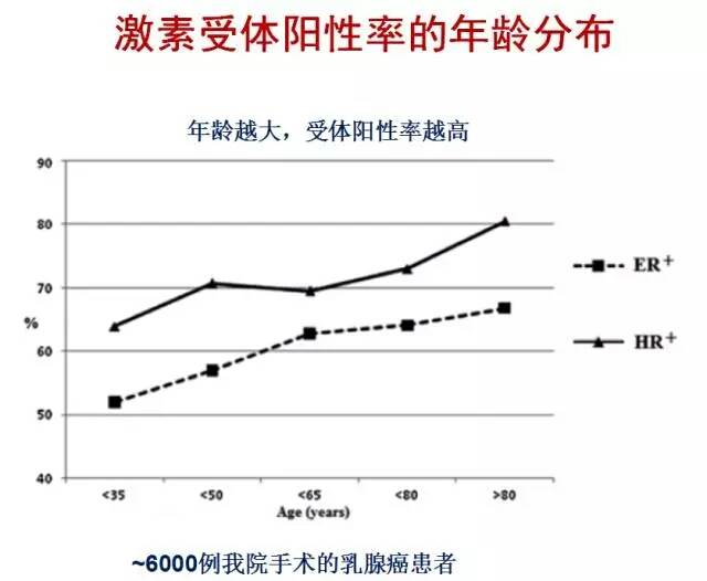 下图(图1)数据是多年前,我的一篇论文中总结分析的结论,我统计了我院7000多例乳腺癌患者年龄和激素受体情况,发现患者随着年龄增长,激素受体阳性占比出现逐渐增高的趋势,80岁群体中激素受体阳性患者占比可达65-%-80%,而小于35岁患者占比大约只有一半。那么有患者会问了,到底是激素受体阳性好还是阴性好?后续我会通过最新数据告诉大家,不同类型乳腺癌无所谓哪个更好,只是复发风险上特点不同、对不同治疗的敏感性不同。