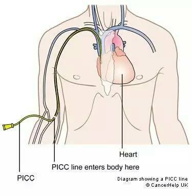PICC是从胳膊上臂血管内插一根导管,导管的末端进入中心大静脉并靠近心脏,另一端则露在外面,用贴膜包起来,使用的时候,护士将输液装置接上外露的导管,药水通过导管进入血管内。