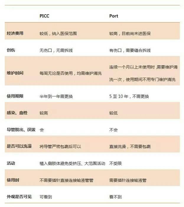 如果患者血小板很低,有出血倾向,则更建议行PICC导管植入,如果两种方式均适合,那么患者可以根据自身情况和两种的导管各自的特点来决定选择何种导管。两种输液方式的比较:(见图)