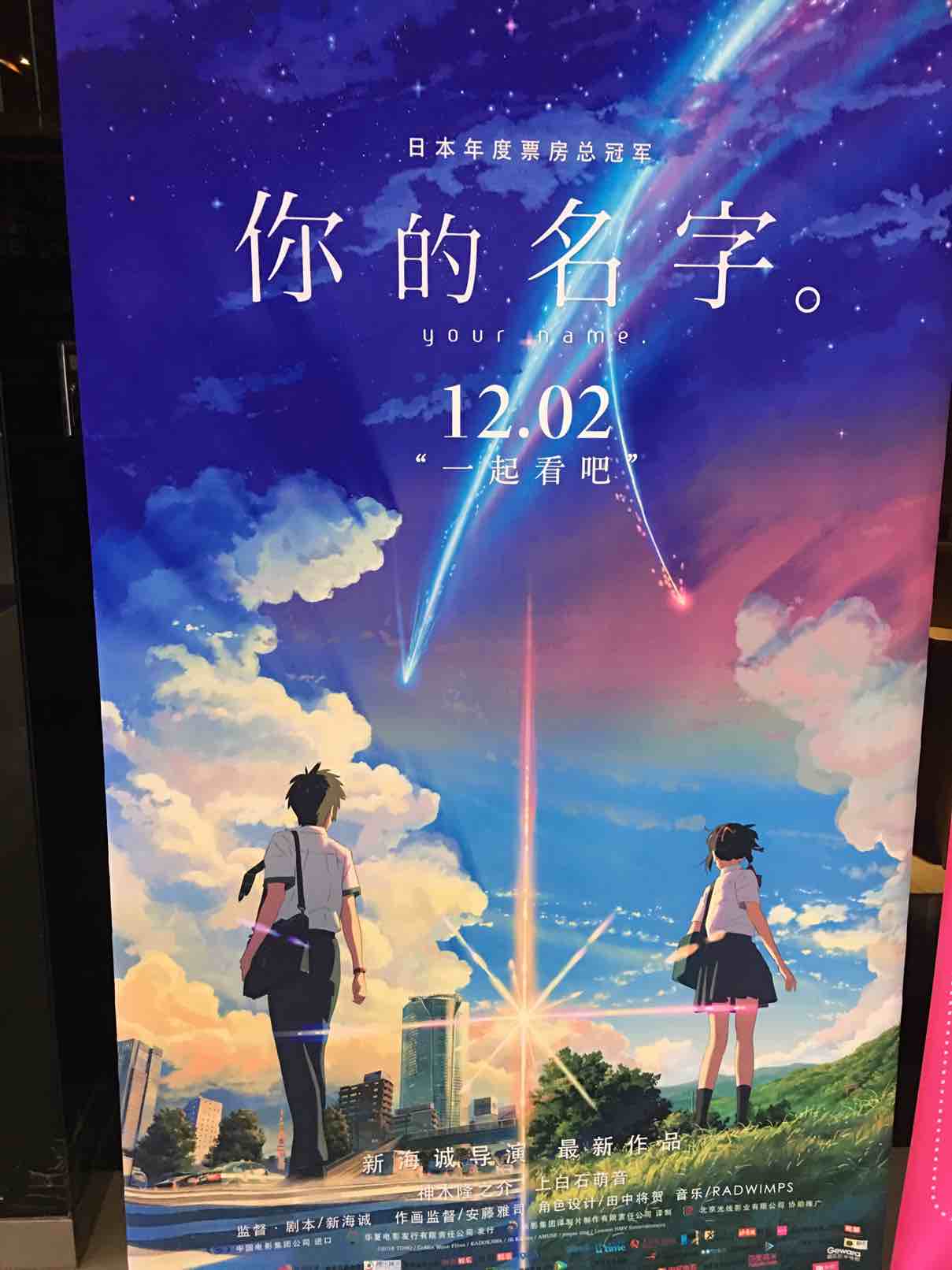晚上小朋友帮我订购了电影票:你的名字,日本动画片,一直喜欢看日本动画片,《樱桃小丸子》《蜡笔小新》《花仙子》让我永远怀念,电影很感动,每个姻缘都是天注定,今生今世都会用红线牵连着,最终都能找到对方。值得一看