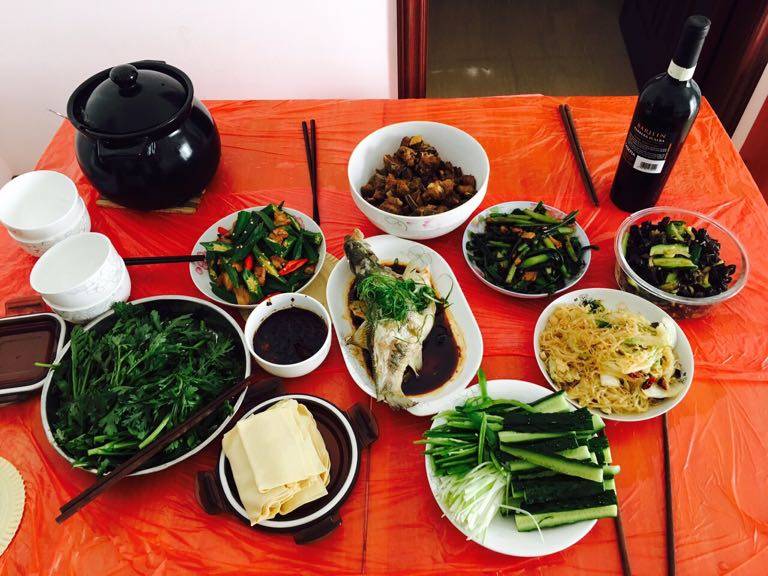 快乐的午餐,8个月的宝贝被妈妈装在大浴盆里,眼巴巴的看着我们吃。小朋友们煲了花胶乌鸡汤,让我补一补。
