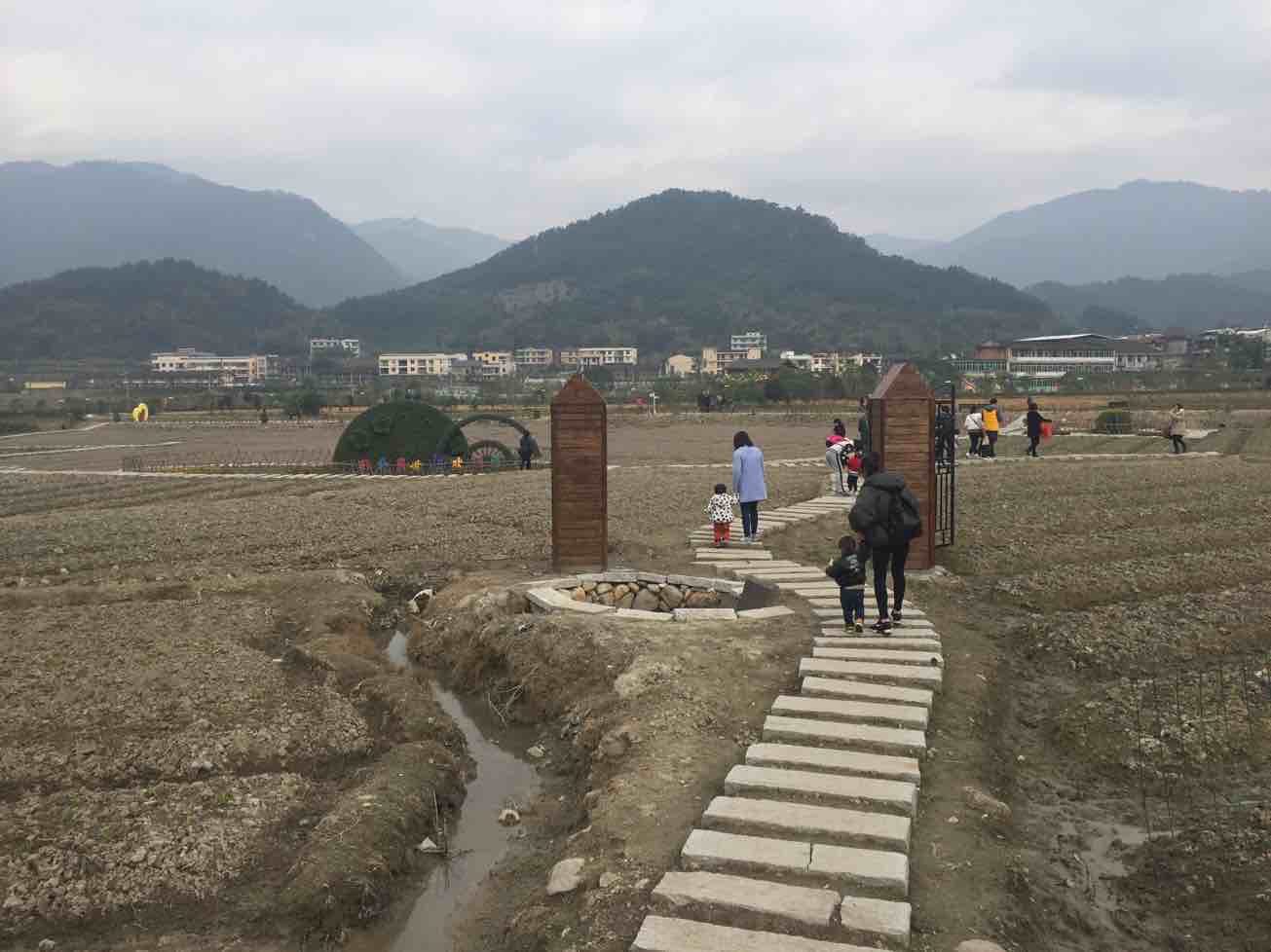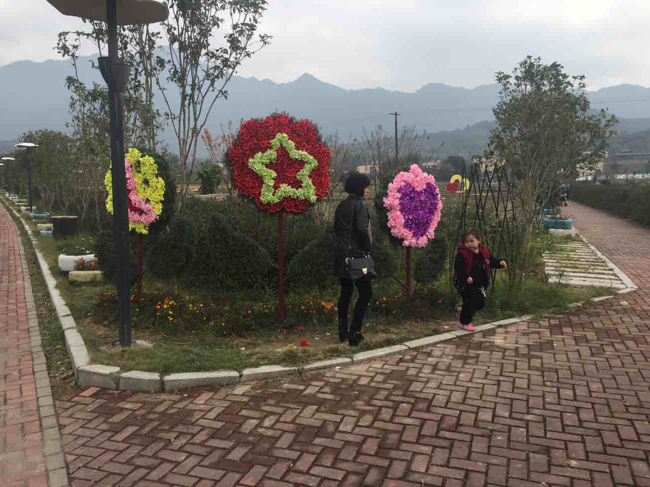 怎么办,高速费交了,油钱花了,总要发掘点什么才不冤对不,于是认真审视起周边的景物,细看之下眼前是一个秀巧的村落,处于群山环抱之中,略远处被林木葱郁的大山环绕,近处是略微小些的山峦围拥,环环相扣,像慈祥的妈妈将娇儿轻揽怀中,小盆地里空气清新洁净,透着丝丝淡甜,不由你不在这里做做深呼吸。九点许的太阳透过云层,显得懒洋洋般的可爱,阡陌纵横间,一条小溪贯穿南北,站在小桥上,看上游溪堰形成的人工瀑布也觉心志娱悦。田野里供人花季时游览的宽阔步道,由条砖铺就,还有条石铺成的窄隘小路四处延伸,路径两旁,用饰品装点或常绿植物修剪而成的小景观随处可见,连用废旧轮胎涂色做成的装饰都显得超级耐看可爱。