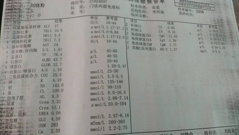 去福建耍了一个多月,都快忘了检查了,两个月没有检查了,生病也快两年了至今不会看结果,就知道补体C3重要?每次检查的时候老公都要给他发过去看看😊,我也挺佩服我自己的,有时候我都不关心我自己,生活当中我不乱吃,也很少熬夜,找个工作吧,干了一个月,就辞了,老公不希望我挣钱,有时候想想觉得上天太不公平了,有个好老公,有一对儿女本来很幸福的家,偏偏在这个时候老天眷顾我让我得了‘狼’