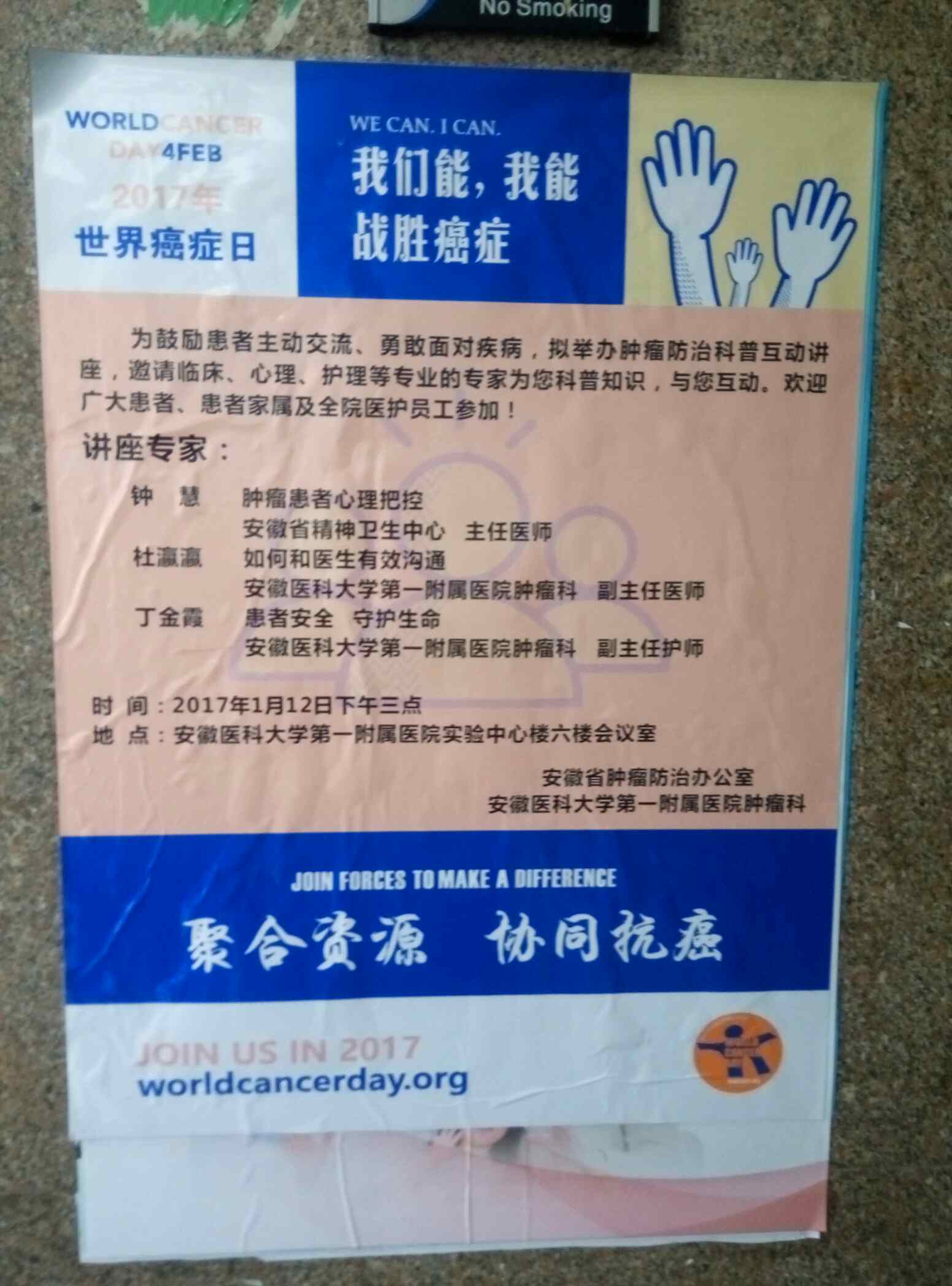 前二天去医院,看到医院有关世界癌症日的演讲活动,我的主治医生也在内。于是我问杜主任演讲的内容,杜主任说:“有时间来听听,关键是钟慧主任说的很好,她是心理科主任,对癌症患者心理方面很有帮助”。