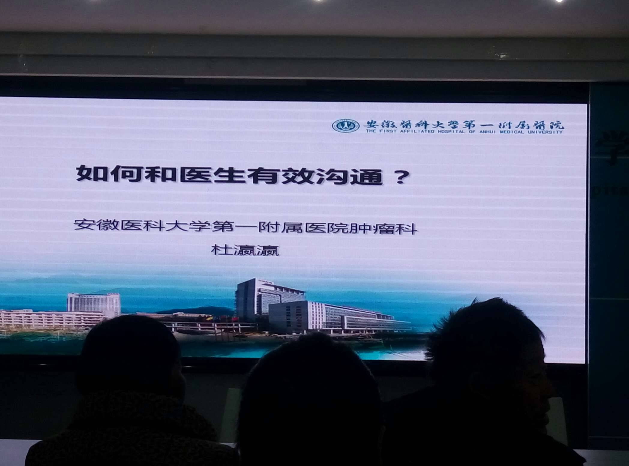 下午我如时到达,小会议室已经有不少人,有医生,护士,病人还有病人家属。说真的,仅仅二小时的课,让所有来者都觉得非常的值。钟主任的娓娓演说,即亲切又能真正的走进病人心里;杜主任的风趣把专业的术语化成了易听和互动的形式。我只能说,小小的一堂课,让我又重新审视了一遍自己。尽管我心态目前已经不错,但仍让我学会了很多的知识,对病的了解,对生命的见解,对医生的理解,对未来的自信。