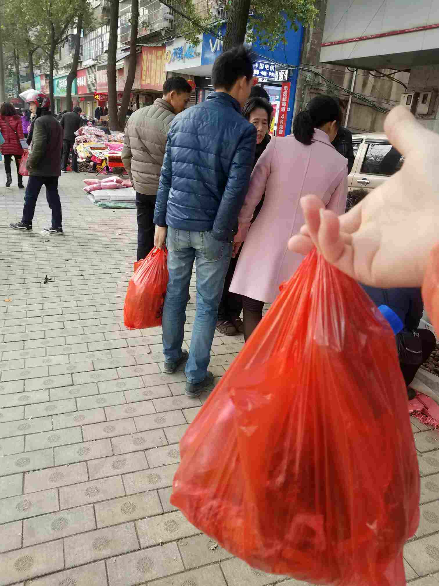 今天午饭过后,婆婆和公公就叫我和老公一起去买年货了,于是我们就去了,公公和婆婆挑选和付钱,我和老公就帮忙提,大袋的老公提,小袋的我提,本来是一件很开心的事,可是回来的时候发生了事故。