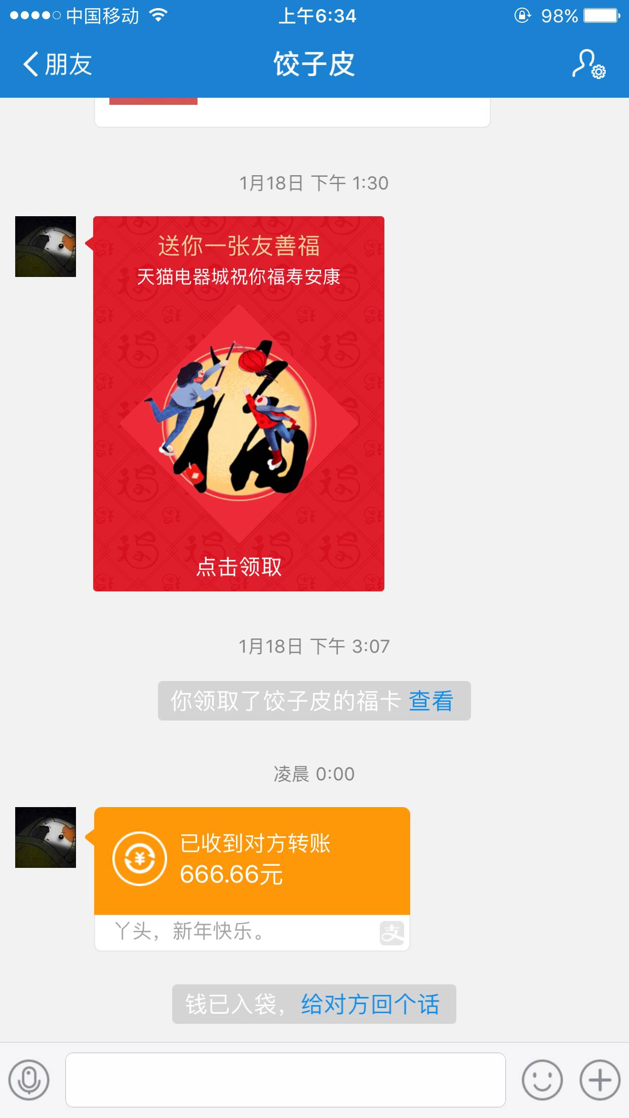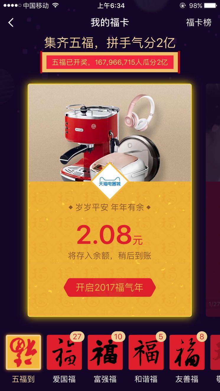 辛苦集个五福,马云爸爸就给了这么点红包,然后早上一开手机就看到男票零点的时候包了个大的,哈哈哈!大家新年快乐啊,健健康康!瘦瘦瘦!美美美!