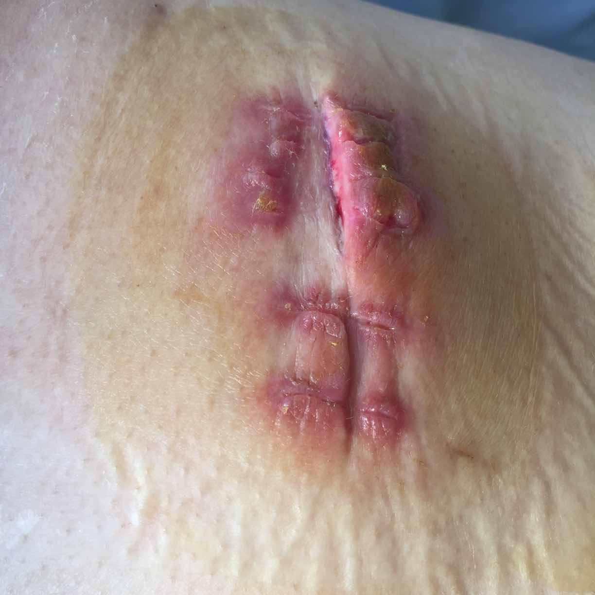 一是你没给医生送红包,二你碰到无良医生,手术创口应该像中间一点点那样对准对齐愈合很快,以后也不会疼痛。