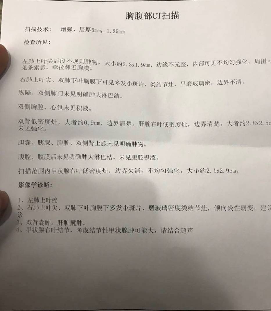 2016年12月23日,妈妈53岁生日突如其来的病毒性感冒一下把妈妈打到了,连续几日的吃药不见起色,输了几天液后有所好转但还是咳嗽声不断,12月29日一个胸片检查让人坐立不安,医生建议拍CT进一步检查,报告显示:左肺上叶见类圆形影,大小约2mm,边见分叶,所属肺段可见少许不张,各级支气管通畅,纵隔未见明显肿大淋巴结,两侧胸腔未见明显积液表现。左肺上叶类圆形影,占位待排。