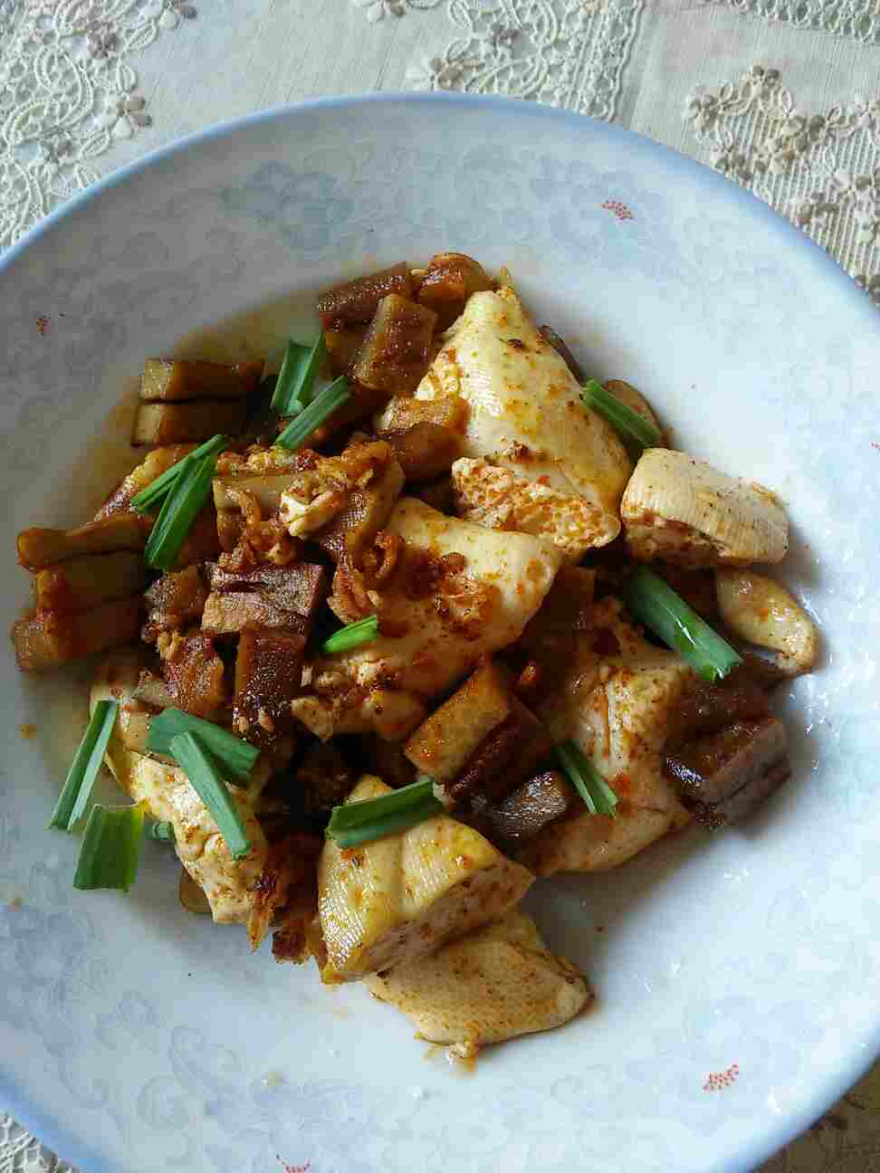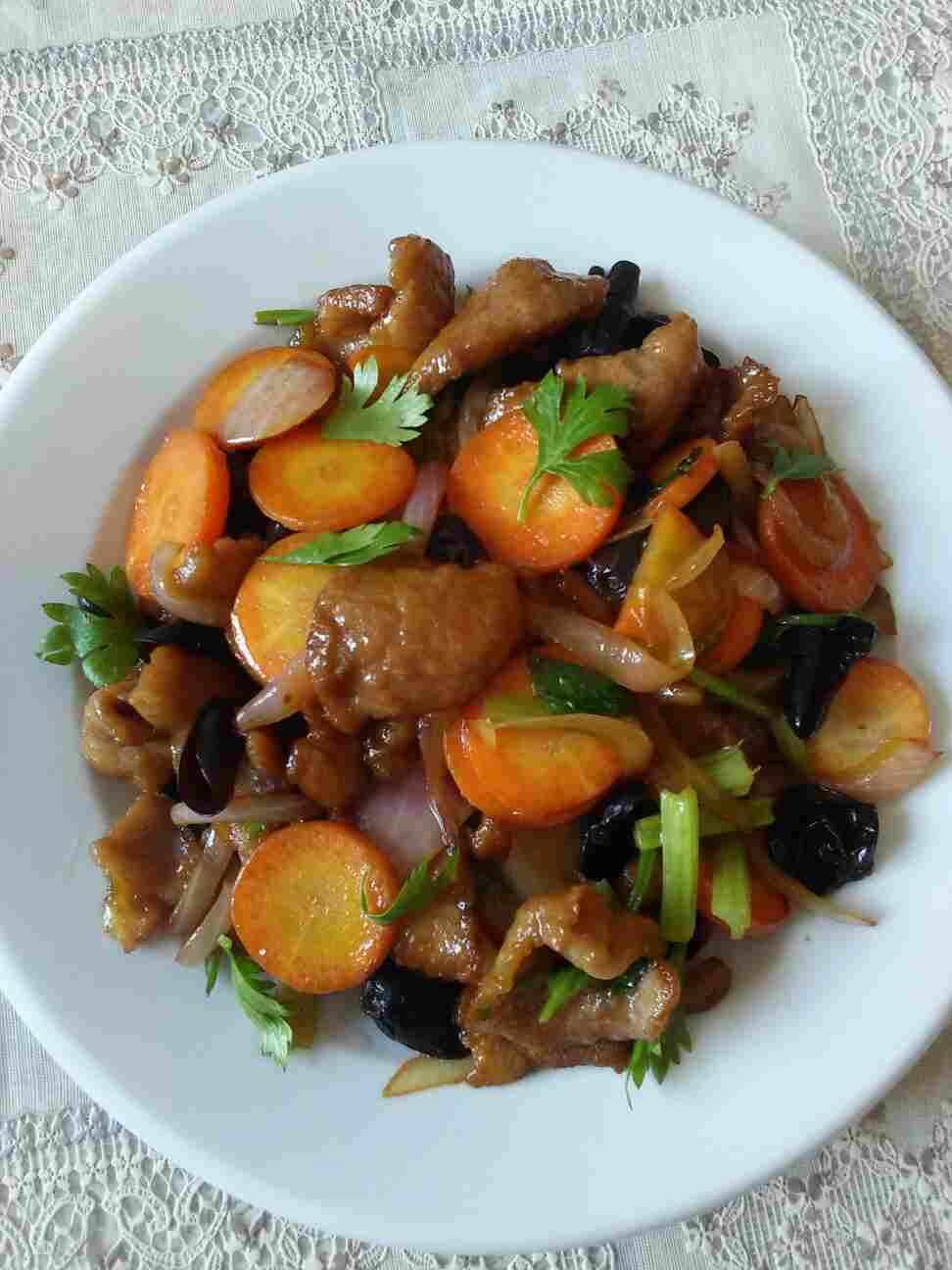,今天是一个肉烧豆腐,一个洋葱木耳胡萝卜杂炒,一个玉米窝头