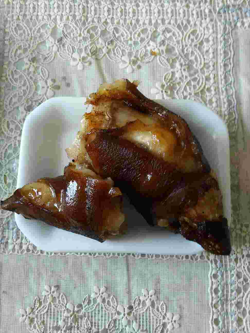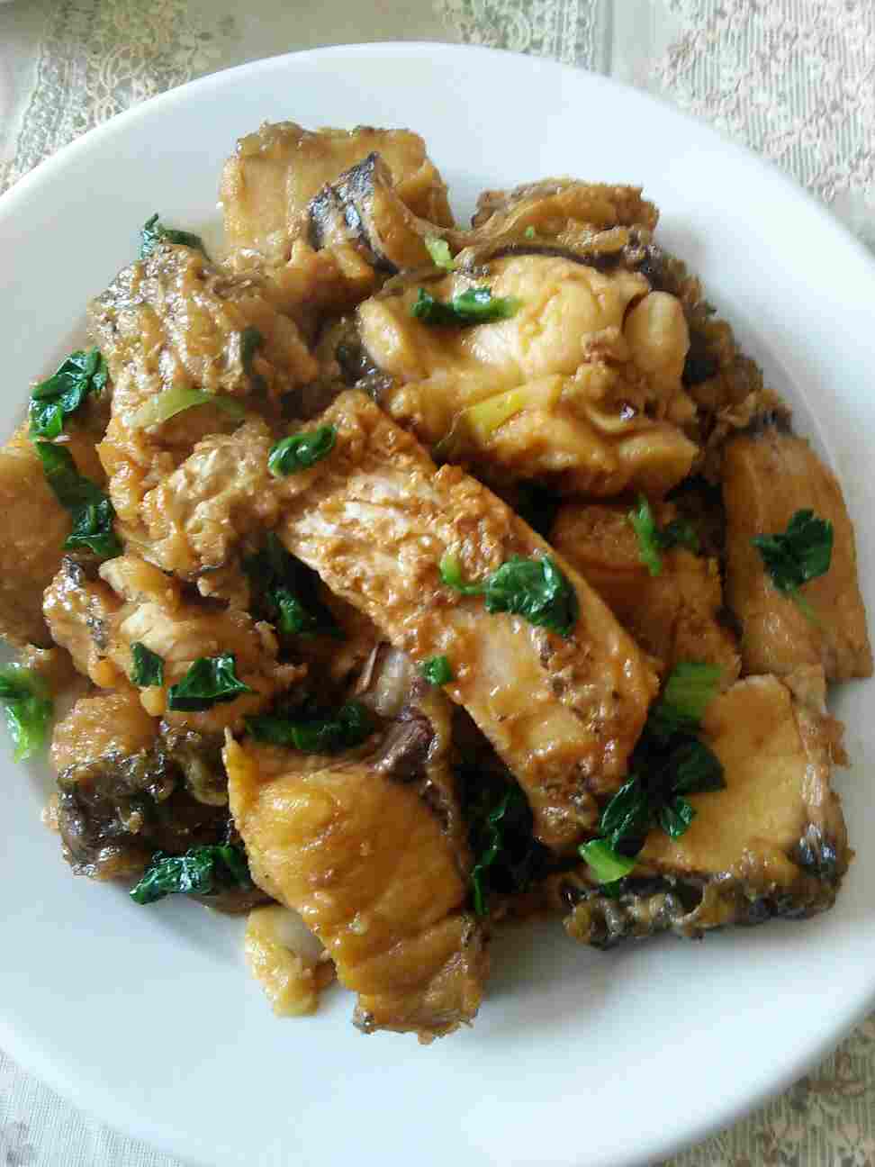 ,今天是一个干烧鱼块,一个素烧小油菜,一小块卤猪手,一碗杂粮饭