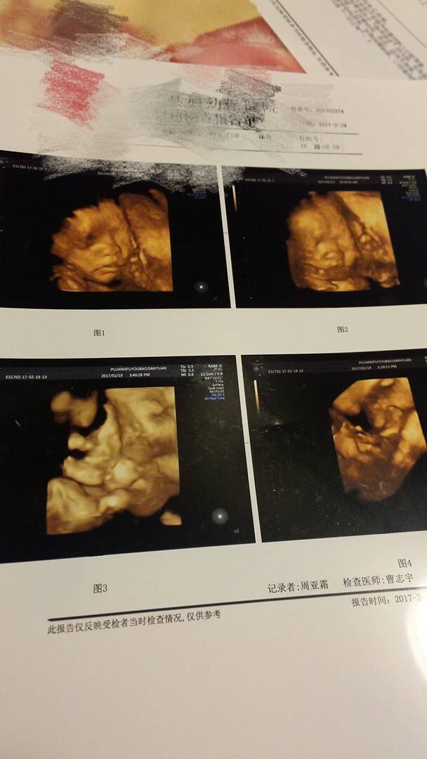 四维做了四次,前几次看不见脸,耳朵,和心脏,医生姿势摆得不好,蜷着和虾米似的,最后一次,医生说没大问题,我就说不复查了,就让他把单子打出来了。医生挺负责的,叮嘱我下次彩超时候看下宝宝的耳朵,这次就只看见一只耳朵,另外一只被胎盘挡了