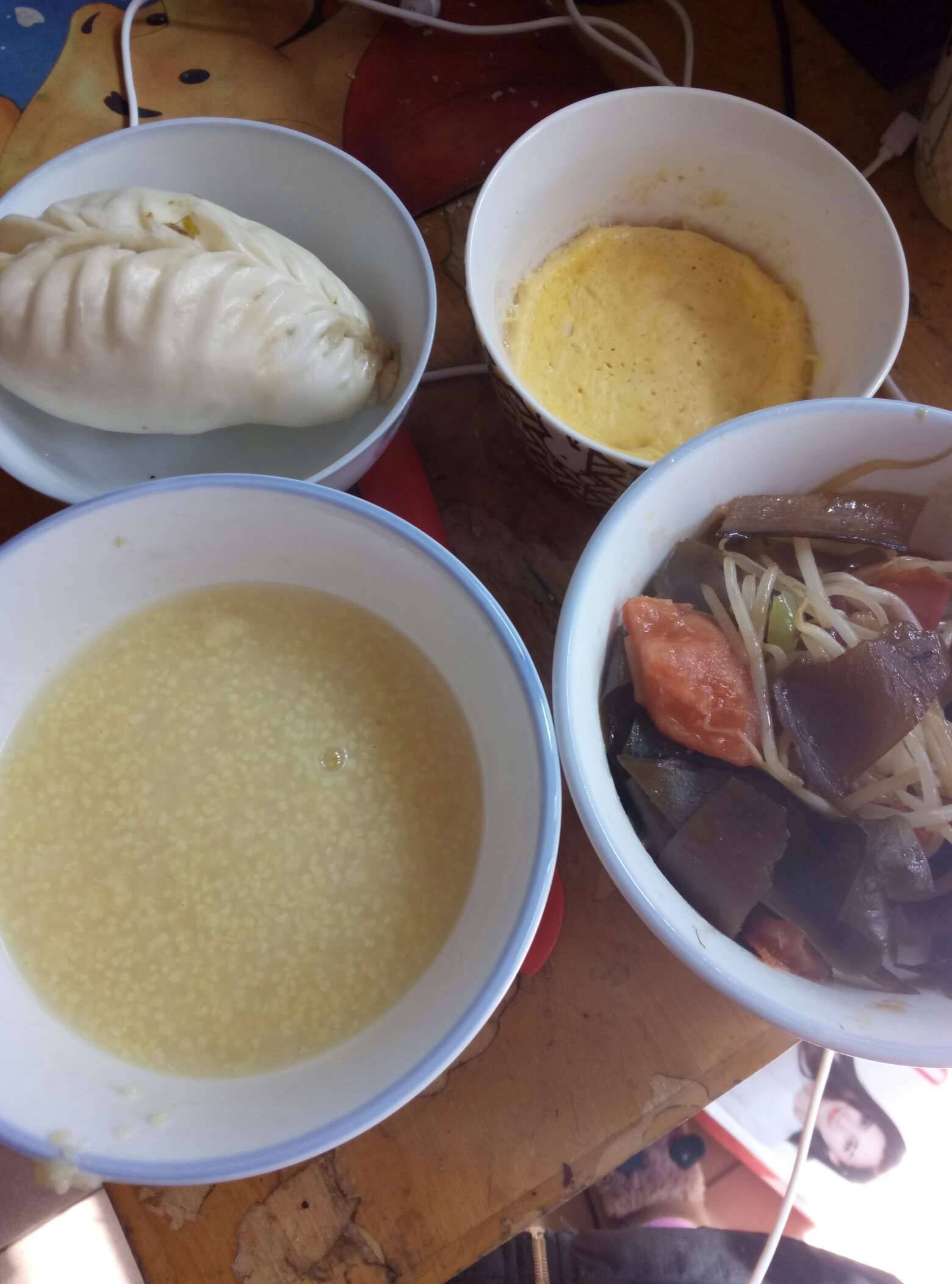 一碗小米粥,一个香菇包,一个蛋羹,一份素菜杂炒,有西红柿🍅海带绿豆芽尖椒。早上吃了挺大一个肉包子,中午没有肉,其实是一直不爱吃肉,病后才有意识吃点肉,好多姐妹们都是尽量吃素的,我和大家正好相反。全素饮食也不好。