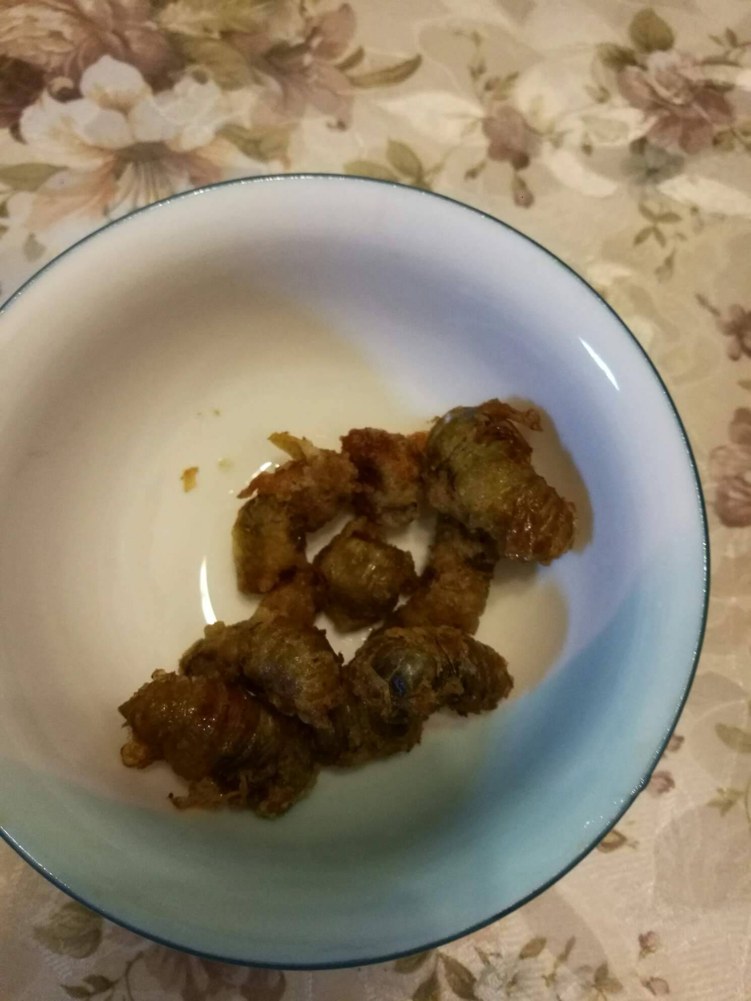 晚餐有小米粥、鲜肉包,炸蝉蛹和凉拌黄瓜。💝💝💝