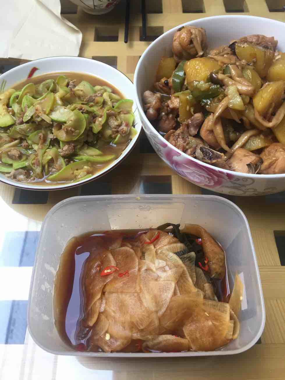 老公有两道拿手好菜,这两道我平时从来不做,怕做好了他就不下厨了。一道是啤酒鸡,一道是酸辣土豆丝。他就靠这两道菜糊弄了我这么多年,现在女儿也是他的粉丝了,不过确实很好吃😋好长时间不下一回厨,人家刀工还是极好的,当当当有模有样的,好吧,切的确实不错。我切萝卜用的是蔬菜擦子