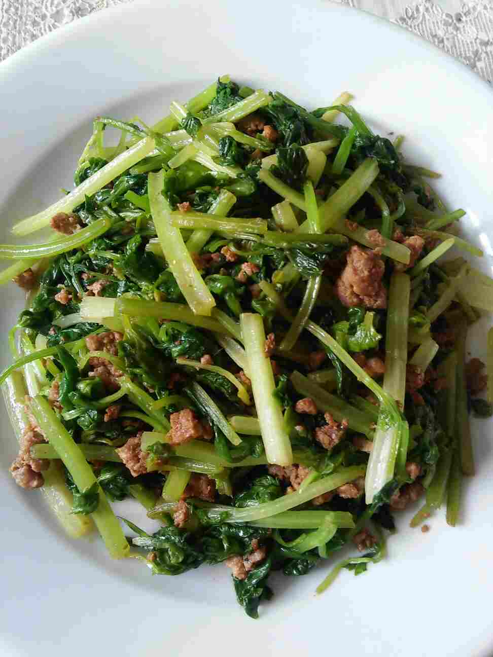 今天的午饭是一个肉沫炒芹菜,一个素烧小青菜,一碗杂粮饭,简单清淡。