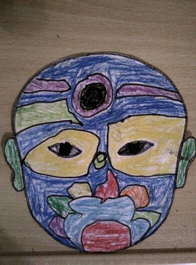 女儿上学期在幼儿园画的京剧脸谱。脸谱的轮廓,耳朵和眼睛是印好的。中间的内容是女儿自己画的。拿回家还说要带面具。