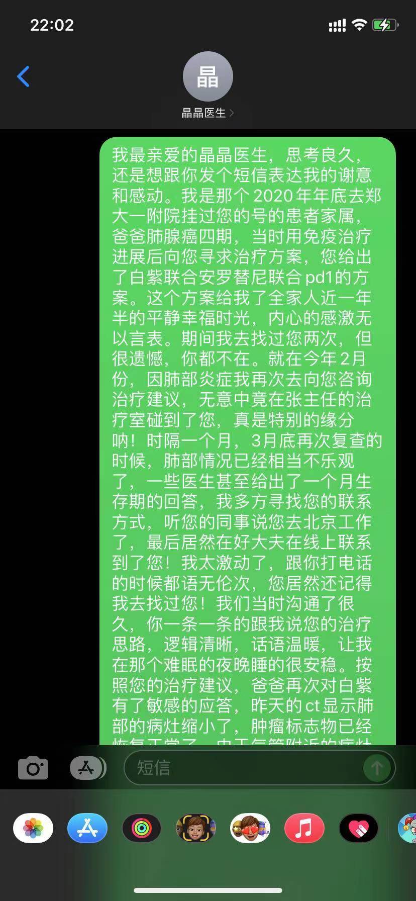 我不死心,在好大夫上,无意中发现了这位医生的号,一直到晚上九点钟,我终于接到了电话,电话那头,温柔的声音再次在我耳边响起,其他医生口中的一个月生存期,拉救护车过来处理症状,不再适宜治疗等等的话在我脑中抛去,我认真的听她清晰明了的话语,每一句都正中我的心坎,回答我的疑虑和担心。最后,我再次厚着脸皮要了这位医生的电话,挂完电话后,心里许久都是暖的。