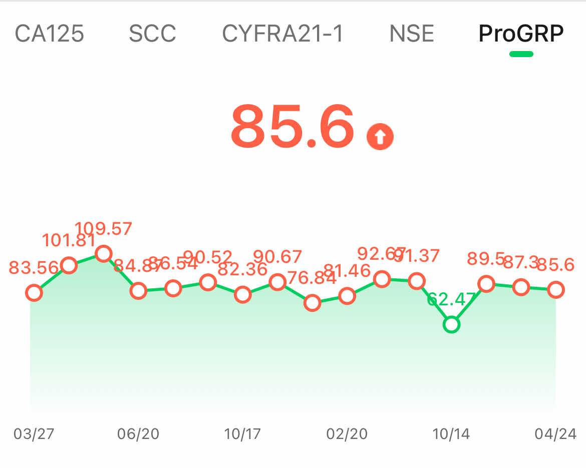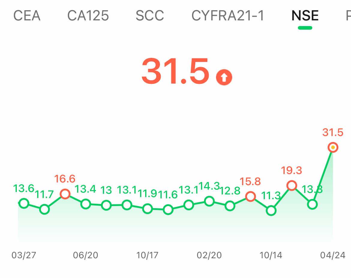 我们的nse 快2年了,一直在16-33之间波动,最近是4月16日化验的,20.30,不知道什么原因,靶向药?