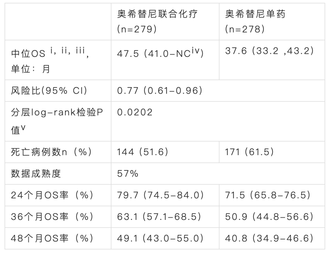 ii.在数据截止时,接受奥希替尼联合化疗治疗的患者中位随访时间为51.2个月(范围0.2-60.4个月),而接受奥希替尼单药治疗的患者中位随访时间为51.3个月(范围0.1-60.1个月)
