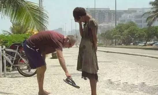 巴西里约热内卢,一个老先生将他的鞋给了一名无家可归的女孩儿。
