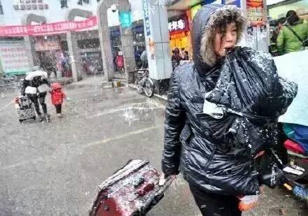 冬天,汉口,长途汽车站,一位母亲一手拿着行李箱,一手抱着孩子,因为害怕风雪冻到了孩子,母亲用牙齿紧紧地咬住了裹着孩子的棉袄。