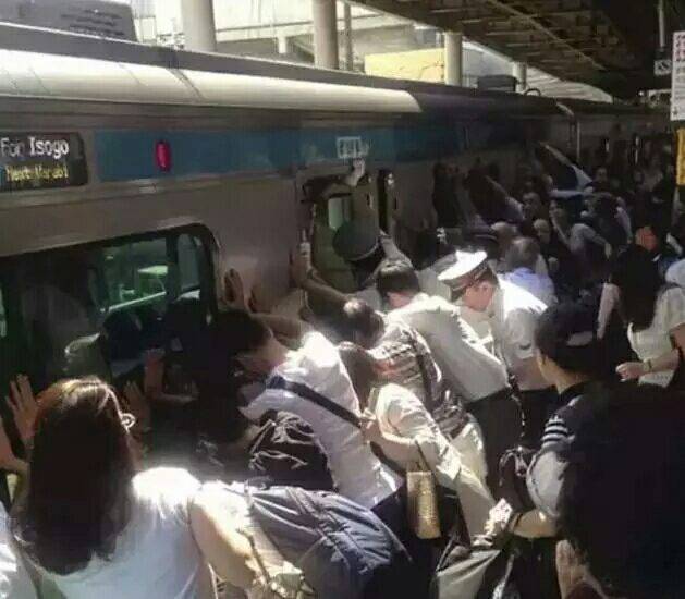在车站,一位女乘客的脚不幸卡在了站台和车厢间的缝隙内,站台广播后,乘客们纷纷下车侧推车体,女乘客最终获救。