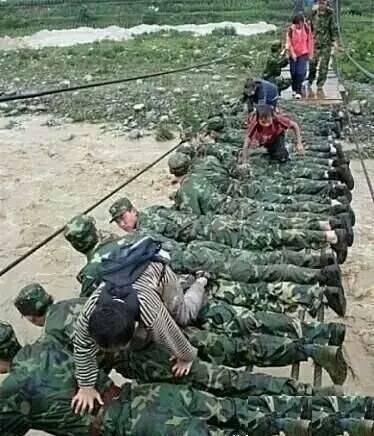 洪水上方,过河的桥有一半都没有了木板,解放军们趴在绳索上,为百姓筑起了人桥。