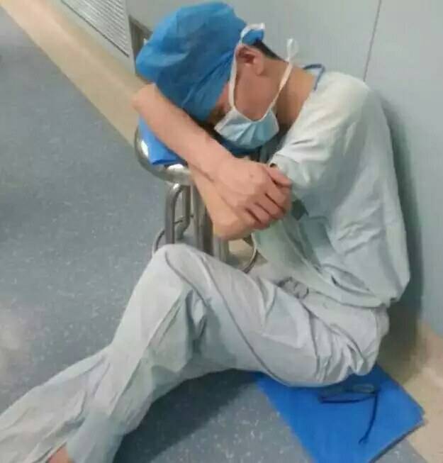 刚下手术台的医生,连续十几个小时的手术让他坐在地上睡着了。