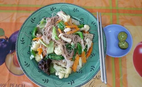 炒糙米米粉:加了瘦肉,青椒,小油菜,菜花,胡萝卜,黑白木耳和白玉菇~配一粒酸柑提味儿💋