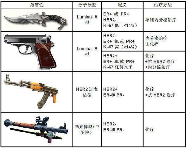 但是,也不能机械地只凭上述分子分型进行治疗,比如说Luminal A 型的患者可以单纯内分泌治疗。但是,如果病变时间很长,发生了腋窝淋巴结甚至其他部位的转移,这时就不能仅仅内分泌治疗了,也要化疗甚至放疗了。这就好比说,拿匕首的小混混如果长时间不消灭,成长为了斧头帮,那危害性也是巨大的!