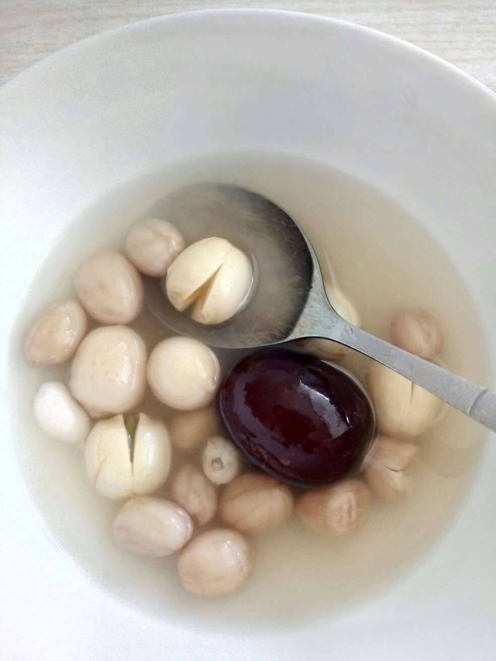 给他煮了莲子花生红枣绿豆羹我的就没放绿豆,冰冰的也很好吃。